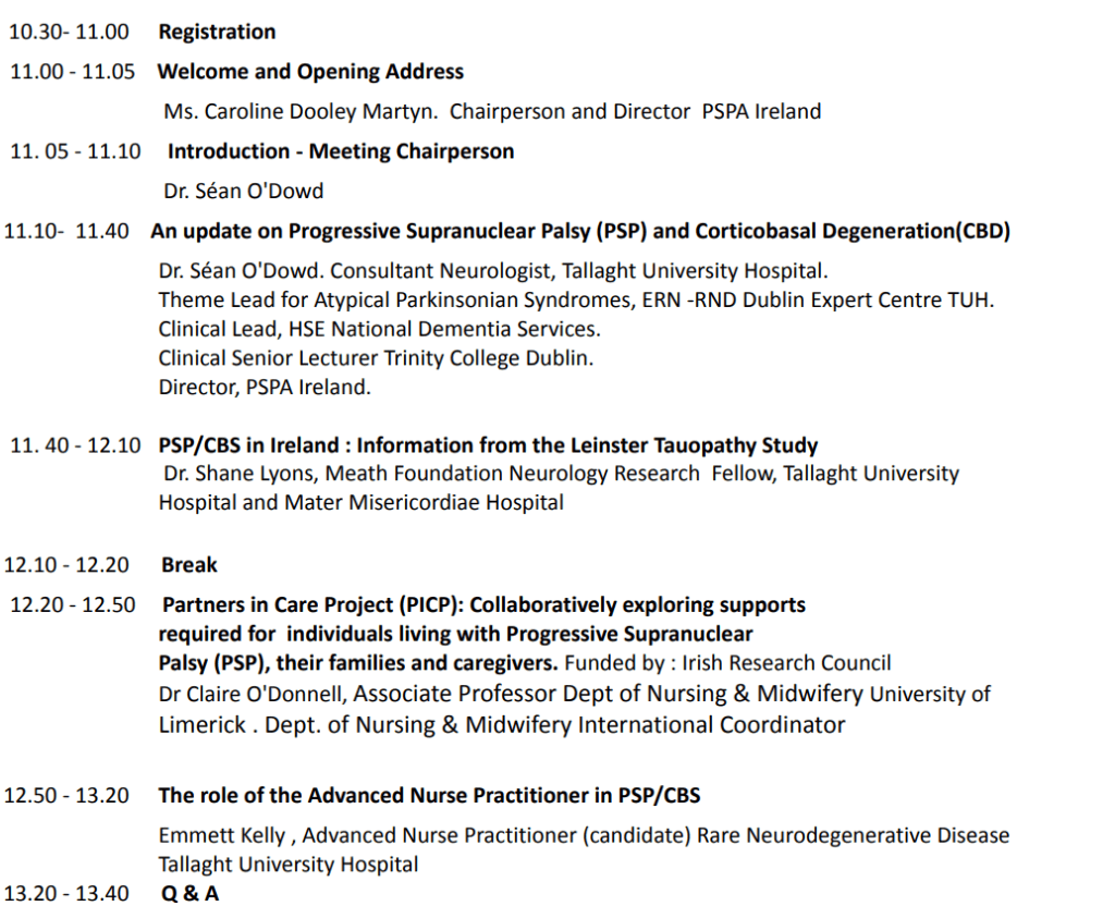 PSPA Ireland is the national support organisation for people affected by the neurodegenerative brain diseases: Progressive Supranuclear Palsy (PSP) and Corticobasal Degeneration (CBD).